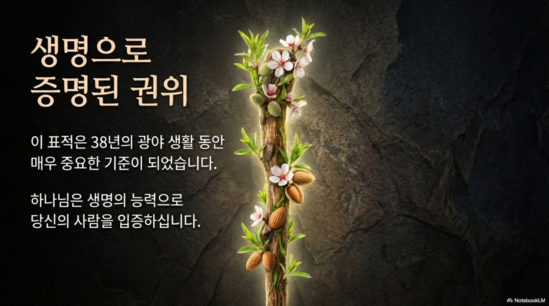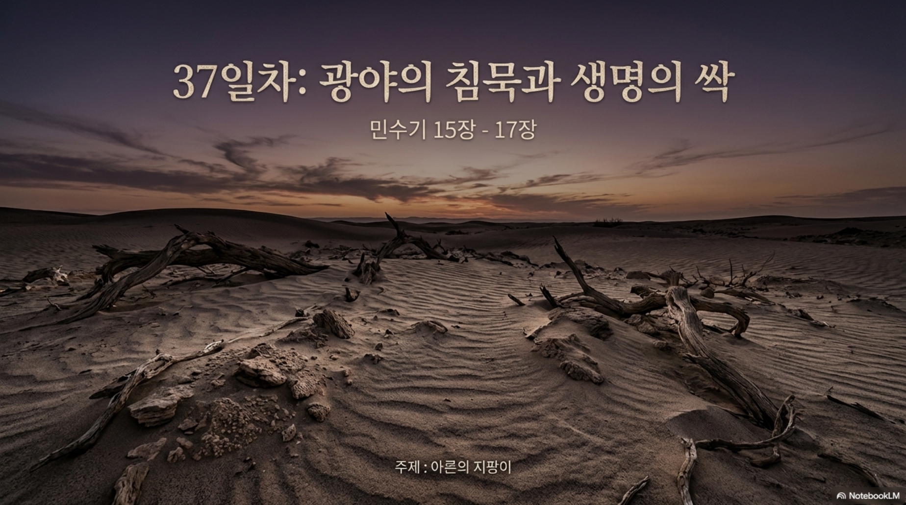 37일차 (민 15-17장) *주제 : 아론의 지팡이 *Reading Guide 민수기 15장에서 19장까지가 광야 38년의 시간입니다. 38년이란 시간은 광야 40년의 기간 가운데 가장 긴 시간이지만 성경은 몇 장밖에 안 되는 분량을 기록하고 있습니다. 광야 38년은 광야 1세대가 죽기까지 기다리는 시간이기 때문입니다. 이렇게 이스라엘 백성은 약 38년 동안 광야에서 먹다 죽는 인생을 살게 됩니다. 사는 이유도 모르고, 목적도 없고, 생각없이 그냥 사는 삶입니다. 그 시간동안에도 이스라엘 백성들은 또다시 반역을 저지릅니다.