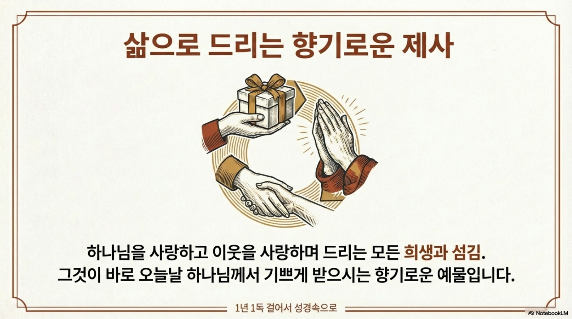 구약의 제사가 짐승의 피를 재물로 드렸다면, 우리는 예수님이 우리 대신에 죽으시고 이미 피를 흘려 주셨기 때문에, 우리 자신을 제물로 드리며 예배할 수 있습니다. 로마서 12장 1절, “형제 자매 여러분 그러므로 나는 하나님의 자비하심을 힘입어 여러분에게 권합니다. 여러분의 몸을 하나님께서 기뻐하실 거룩한 산 제물로 드리십시오. 이것이 여러분이 드릴 합당한 예배입니다.” 우리가 하나님을 사랑하고 이웃을 사랑하여 드리는 모든 희생과 섬김이 하나님께서 받으시는 향기로운 예물과 제물입니다.