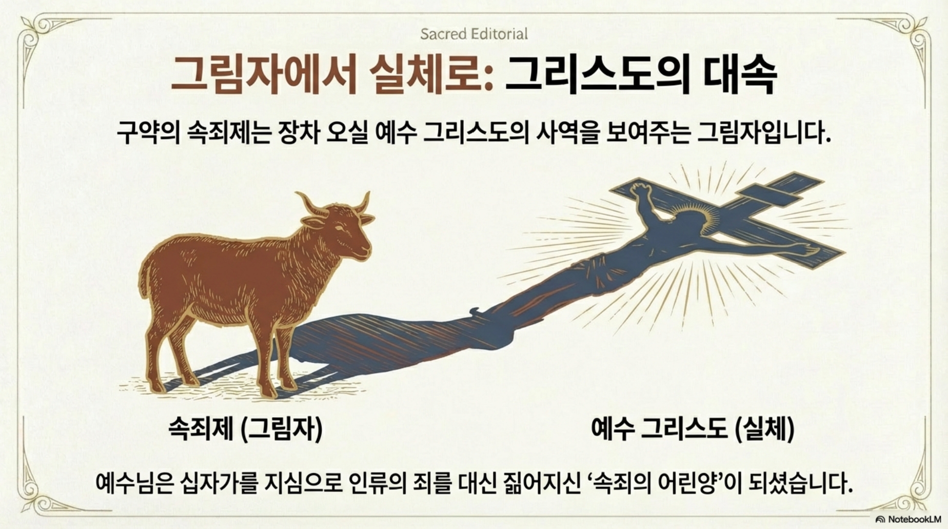 속죄제는 예수 그리스도께서 십자가를 지심으로 모든 인류의 죄를대속하신 ‘그리스도의 대속 사역’을 상징합니다. 예수께서는 실로 속죄,희생의 어린양이 되셔서 모든 인류의 대속물이 되셨는데, 그의 죽음의 장소는 속죄제 희생 재물이 진 바깥 정결한 곳에서 불살라진 것처럼 예루살렘 성 바깥의 영문 밖, 골고다 언덕의 십자가 였습니다.