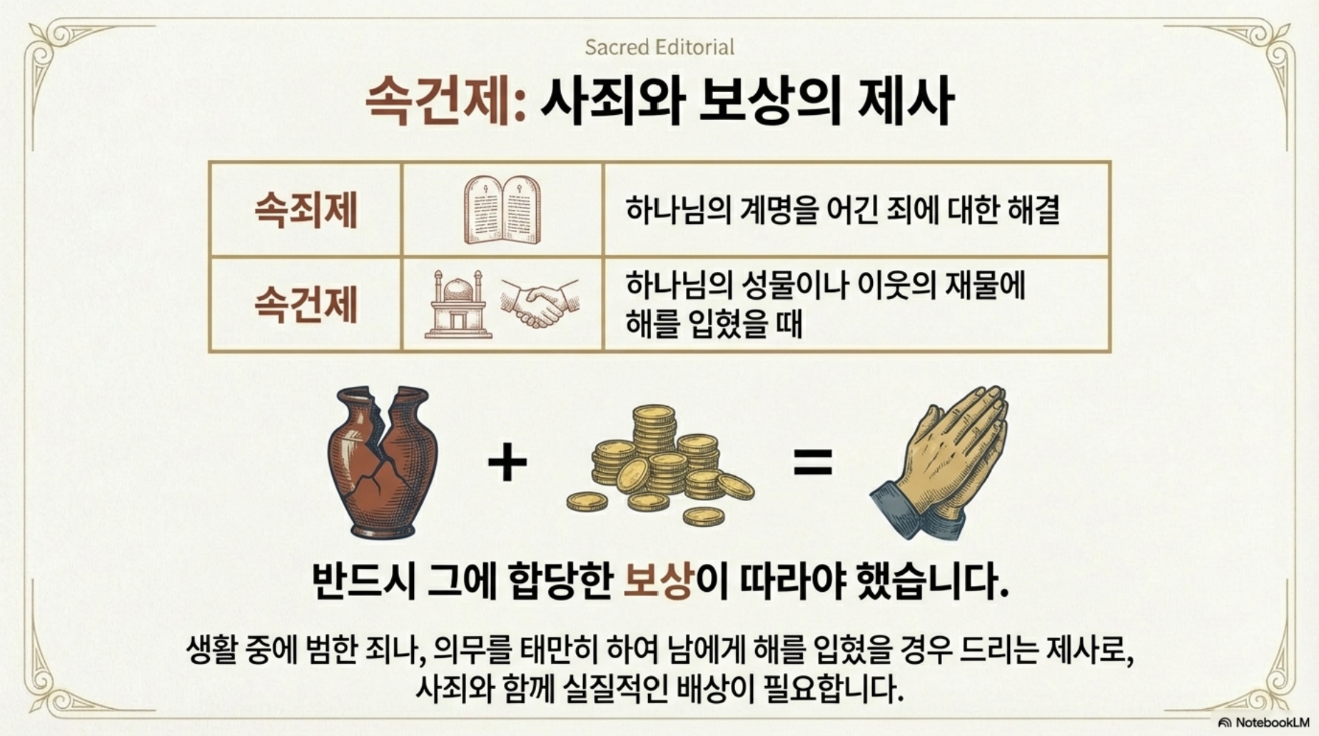 오늘은 구약의 5대 제사가운데 속죄제와 속건제에 대한 말씀입니다. 어제 번제, 소제, 화목제에 이어 속죄제와 속건제에 관한 정보를 읽습니다. 속죄제는 죄와 밀접한 연관이 있는 제사입니다. 특별히 속죄제의 제물은