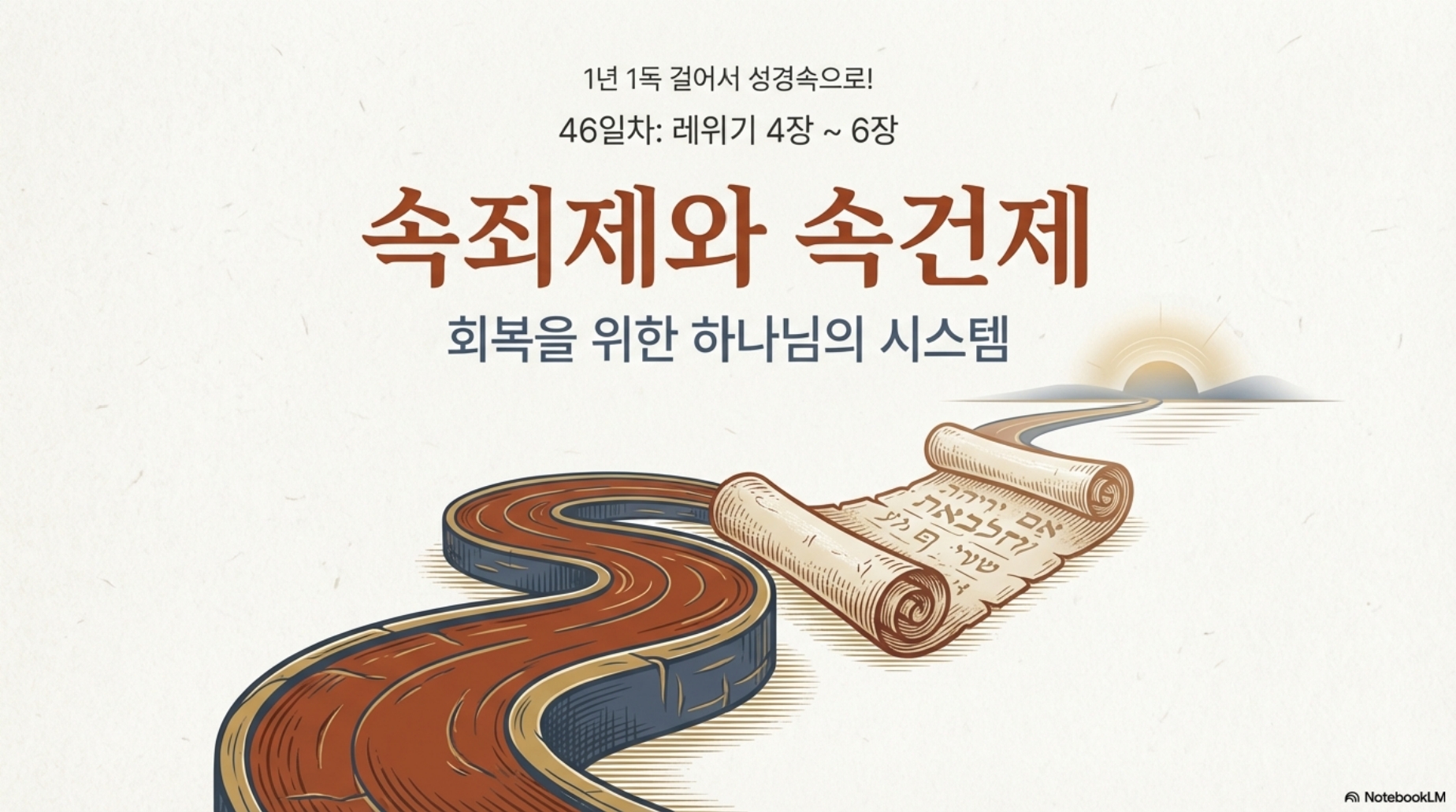 46일차 (레4-6장) *주제 : 속죄제와 속건제 *Reading Guide 모세가 쓴 창세기, 출애굽기, 레위기, 민수기, 신명기 이렇게 다섯 권의 책을 모세 오경 그중에 제일 중심이 되는 책은 레위기 창세기 - 레위기의 율법을 주신 분, 곧 하나님이 누구신가를 알려주는 것이 창세기. 출애굽기 - 역사적 배경을 쓴 것이 출애굽기. 민수기 - 레위기대로 사는 실전 광야 훈련의 이야기를 기록 신명기 - 광야 2세들에게 다시 레위기를 복습, 설교한 책 역사서 12권 - 레위기의 법대로 살았는가 못 살았는가를 기록 선지서 - 그 율법대로 살지 못하면 어떻게 되는지를 경고 시가서 - 하나님이 주신 율법을 지키고 살면서 겪는 기쁨, 고뇌, 사랑을 노래 그러고 보면 이 레위기를 중심으로 구약이 돌아가고 있습니다. 이렇게 중요한 책이니 다소 지루하다 느껴지더라도 눈을 크게 뜨고 읽어 봅시다.