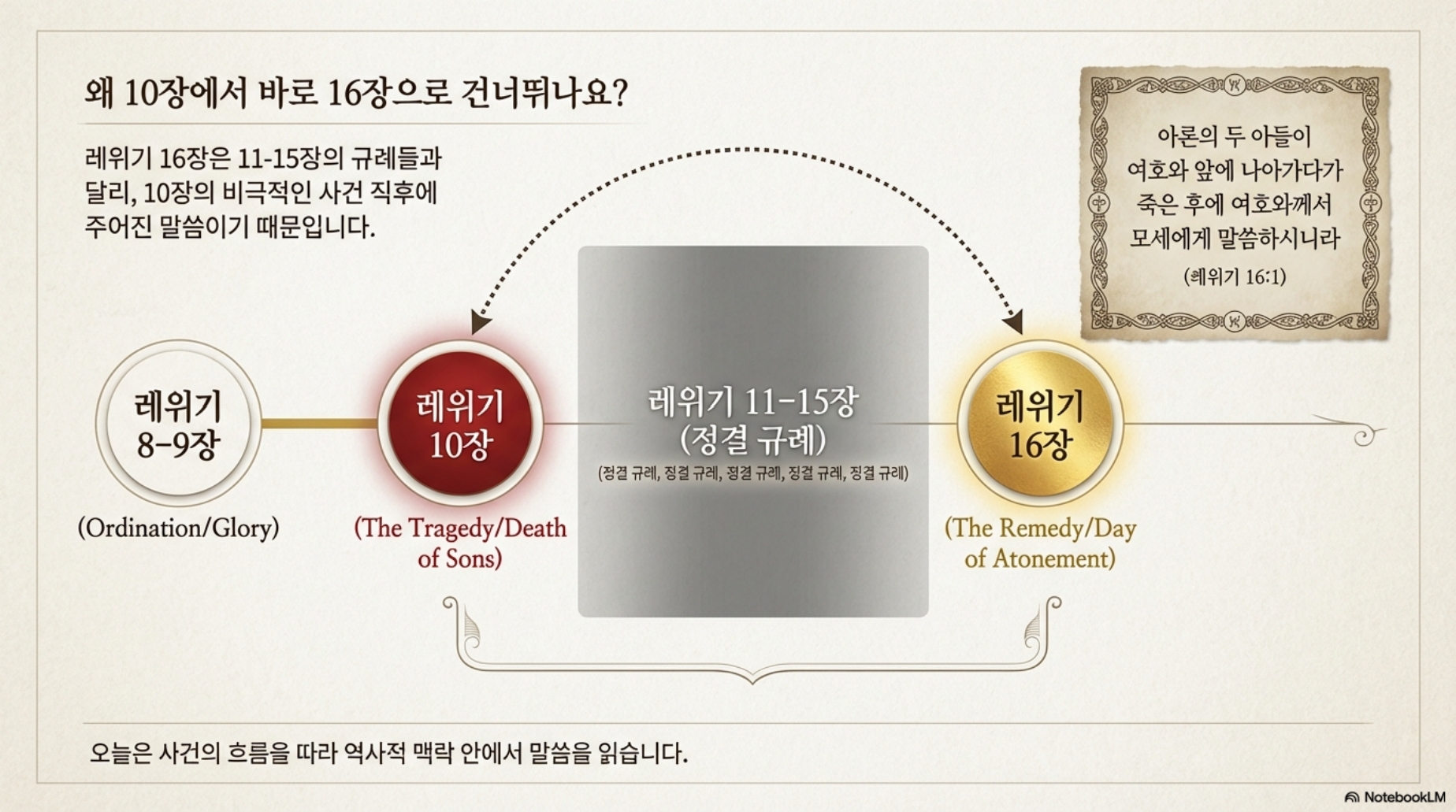 10장에 이어 16, 17장을 같이 읽으시면 연결이 될 것입니다. 16장 1절에 “아론의 두 아들이 여호와 앞에 나아가다가 죽은 후에 여호와께서 모세에게 말씀하시니라” 말씀하고 있습니다. 따라서 10장에 이어서 읽는 것입니다.