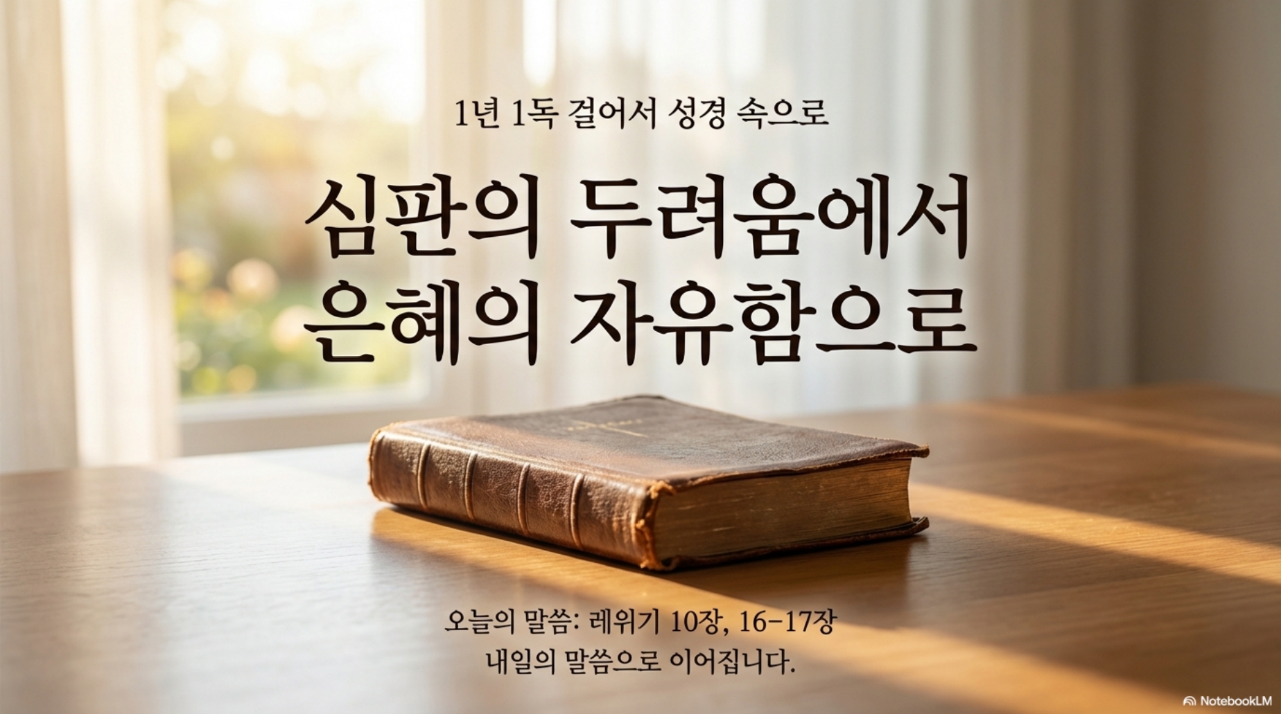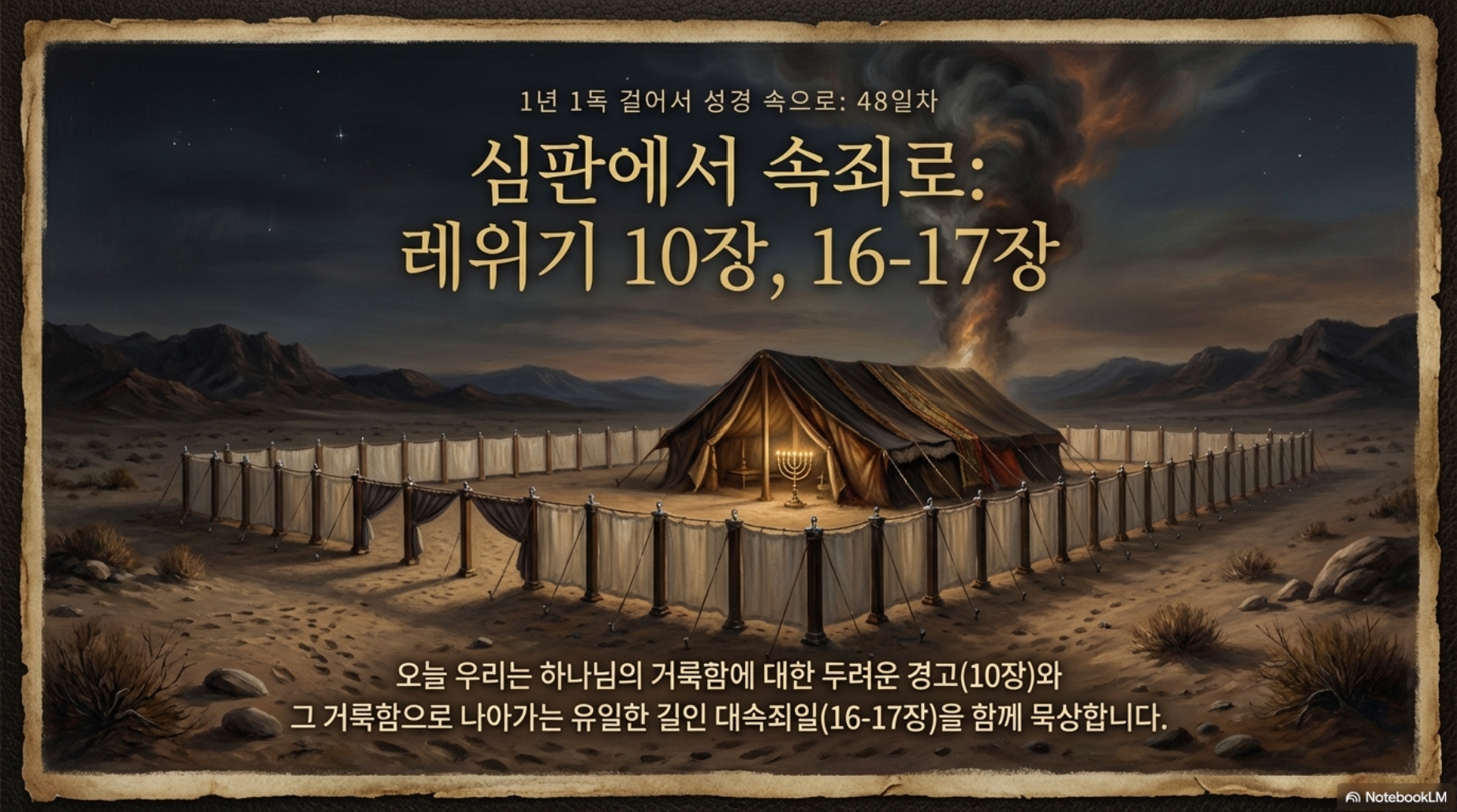 48일차 (레10,16-17장) *주제 : 제사 실전에 이어지는 내용(속죄일) *Reading Guide 오늘은 레위기 10장과 16장, 17장을 읽을 것입니다. 왜 10장 다음에 11장이 아닌 16장이냐면 같은 사건에 배경속에 이루어지기 때문입니다. 주인공이 누구냐면 나답과 아비후입니다. 어제 우리는 제사장의 위임식과 첫제사를 드리는 장면까지 읽었습니다. 칠일동안의 위임식에 이어 팔일째에 하나님의 영광이 나타나셨습니다. 그런데 놀랍게 아론이 대제사장으로 사역을 시작한 바로 그날에 아론의 맏아들과 둘째 아들인 나답과 아비후가 분향단에 다른 불로 불향하다가 하나님이 명령하신 그대로를 지키지 않았기 때문에 하나님께로 불이 내려와 즉사했습니다.
