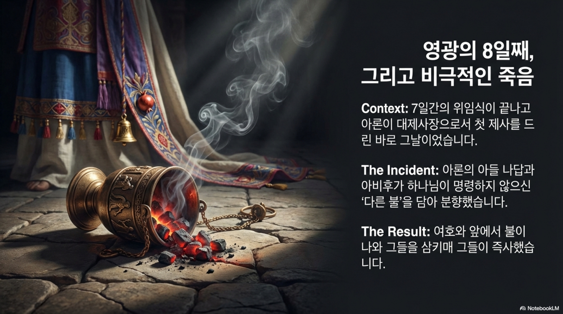 얼마나 당혹스럽고 두려웠겠습니까? 이 장면을 목도한 제사장들과 백성들은 하나님의 법도가 얼마나 엄중한 것인가를 알게 되었고, 예배드리는 일에 대해서 경건하고 바르게, 거룩하게 해야 하는가를 교훈을 받았을것입니다.