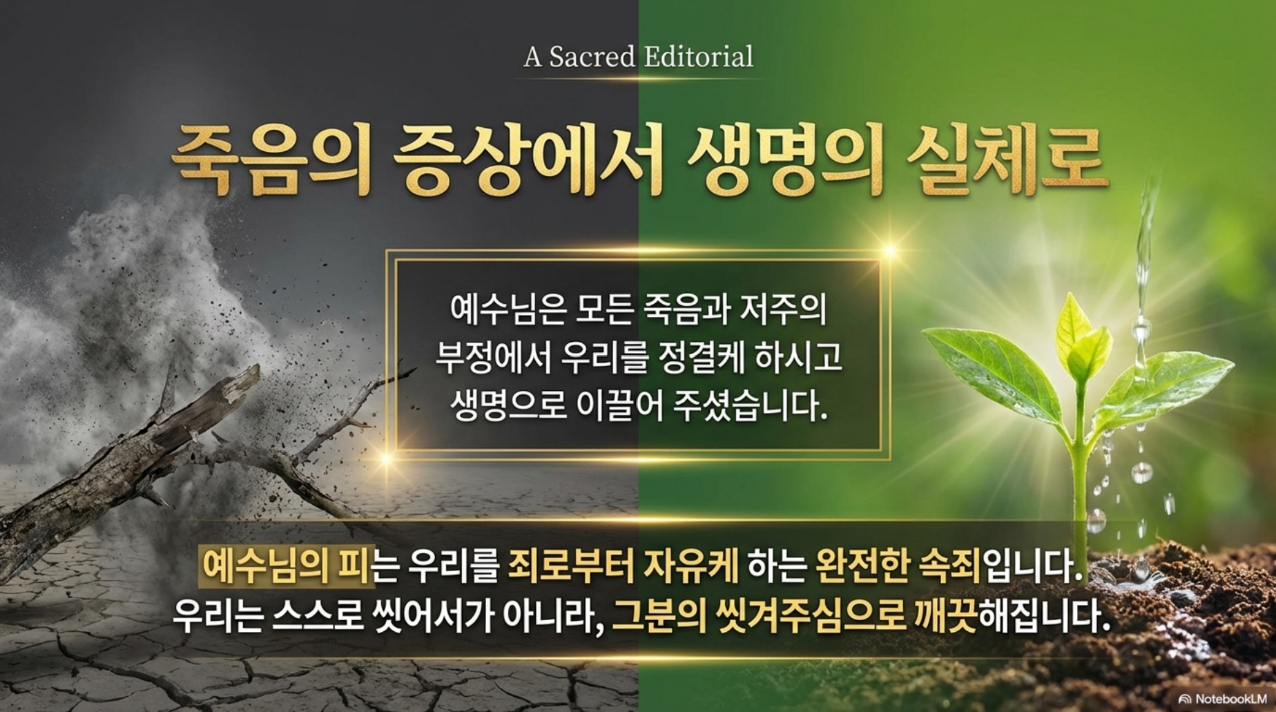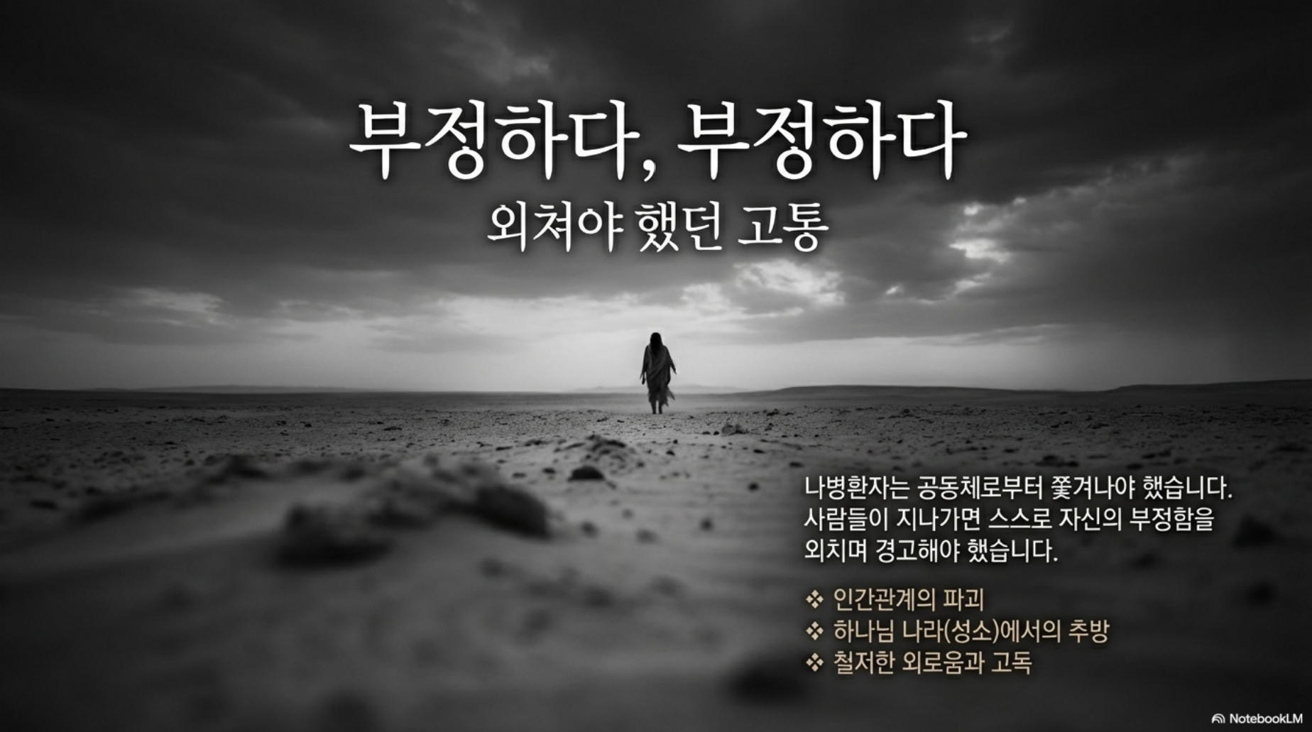 레위기 13장과 14장에 나오는 나병 환자 이야기는 레위기 법에 보면 되게 본문이 꽤 길게 나옵니다. 왜 하필이면 성경은 나병 환자에 대한 관심이 그렇게 많을까요? 물론, 위생학적으로 보면 전염되기 때문에 되게 위험한 질병이기 때문에 그렇다고 볼 수가 있겠지만, 그런 측면도 있겠지만, 사실 이 이야기는 영적으로 봐야 되는 거예요. 나병은 어떻게 보면 우리 인간의 죄악, 부패한 인간의 속성을 가장 잘 드러내 주고 보여주는 질병이 바로 나병입니다. 뿌리에서부터 인간은 마음, 심이 부패해서 뿌리에서부터 사실 썩었습니다. 그래서 우리는 가만히 놔두면 중간을 유지하는 것이 아니라 가만히 놔두면 계속해서 썩어가고 계속해서 하나님으로부터 멀어질 수밖에 없는 존재입니다. 또 우리의 부패한 속성은