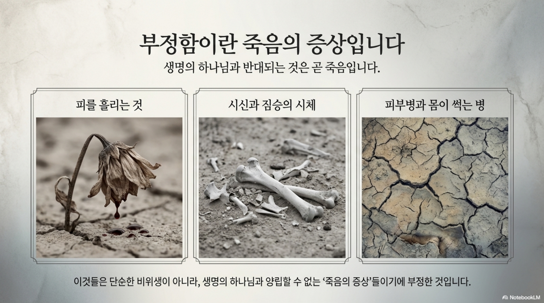 결국 생명에 반대되는 것도 부정적인 것입니다. 부정한 것이죠. 시신, 시체, 짐승의 시체도 안 되고 사람의 시체도 안 됩니다. 이런 것을 건드려서도 안 되고, 이것은 모두 죽음의 증상입니다. 하나님은 생명이 넘치시는 생명의 하나님인데, 생명의 하나님과 반대되는 것은 죽음의 증상입니다. 피부병이 생기거나 몸이 썩는 나병 환자 등이 모두 죽음의 증상이며, 이것도 부정한 것입니다.