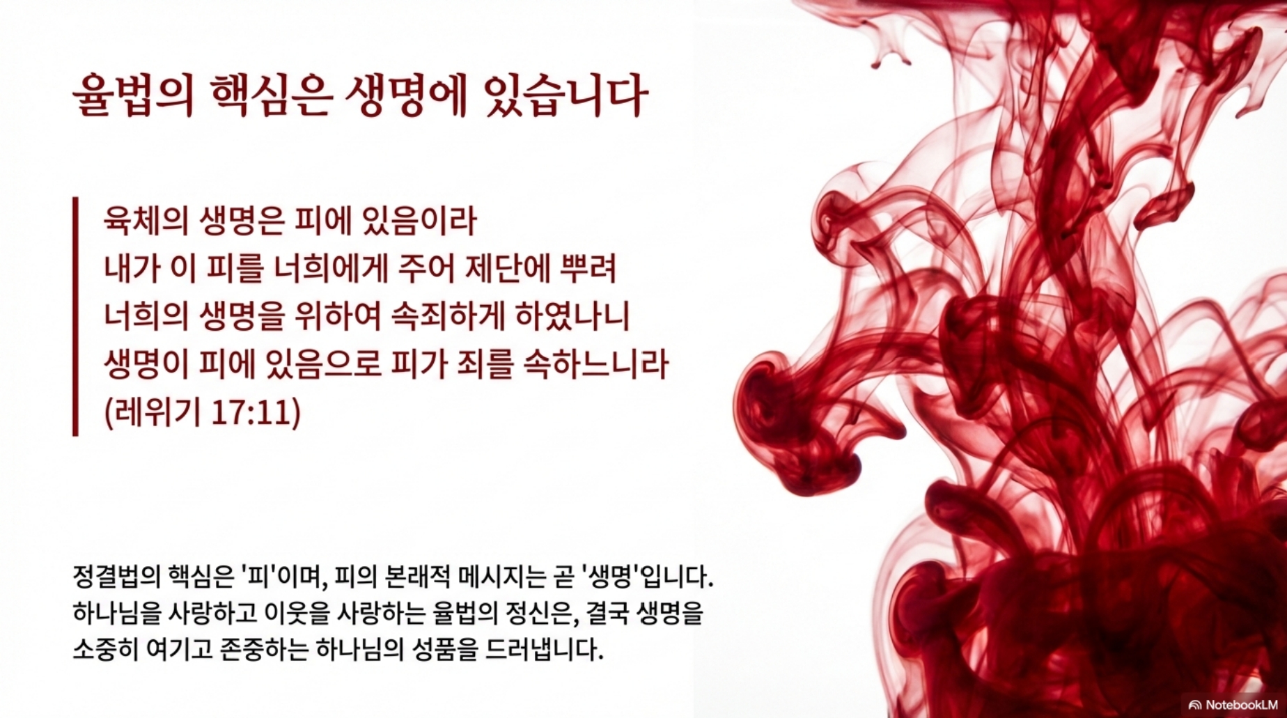 쉽게 얘기해서, 하나님은 창조주 하나님이시죠. 그리고 생명을 사랑하시죠. 모든 사람들 구원받기를 원하시죠. 하나님께서 우리에게 원수까지도 사랑하라고 하셨죠. 율법을 주시면서 하나님께서 이스라엘 백성들이 거룩하게, 그들이 하나님의 뜻에 따라 살기를 원하셨는데, 율법의 최고의 정신은 하나님을 사랑하고 이웃을 사랑하는 거죠. 다른 말로 하면 생명을 소중하게 여기고 생명의 삶을 살아가는게 바로 율법의 메시지라는 겁니다. 정결법뿐만 아니라 레위기