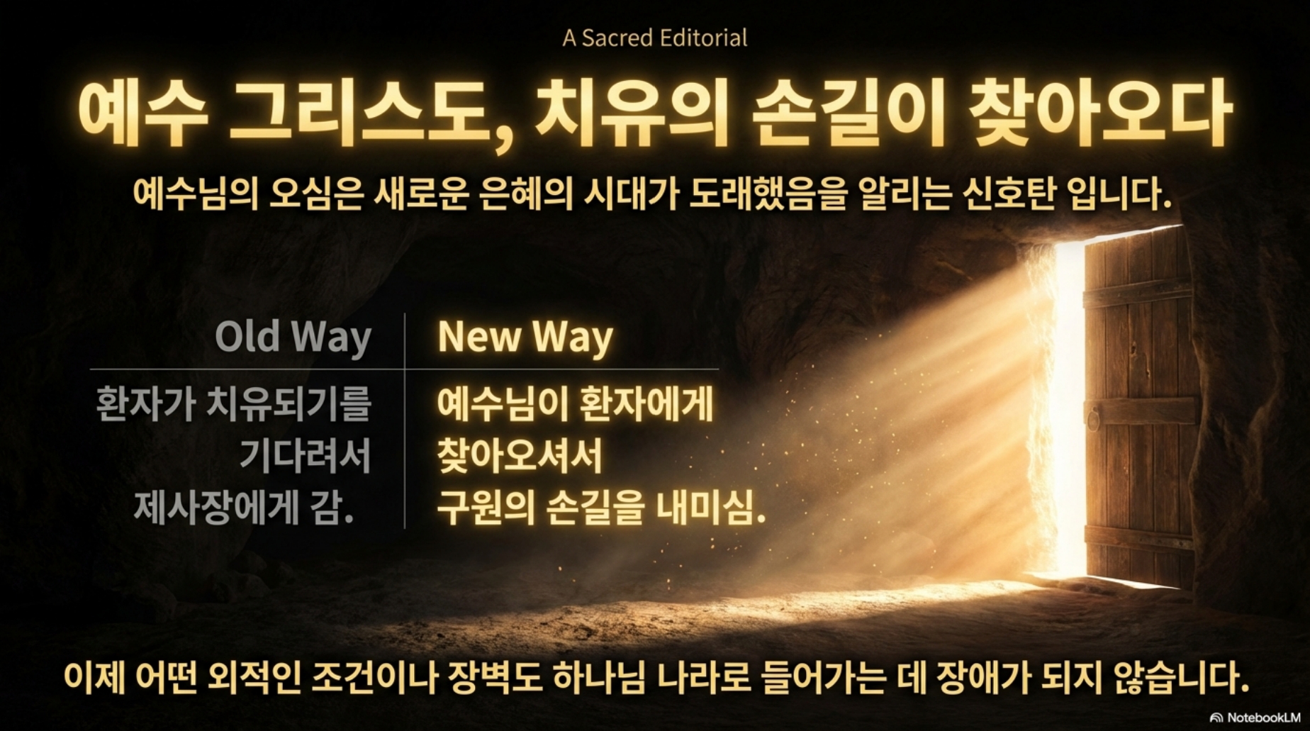 말미암아 나병환자에게 구원의 손길을 베푸신 것은 예수 안에서 새로운 시대가 도래했음을 보여주시는 증표였습니다. 예수님