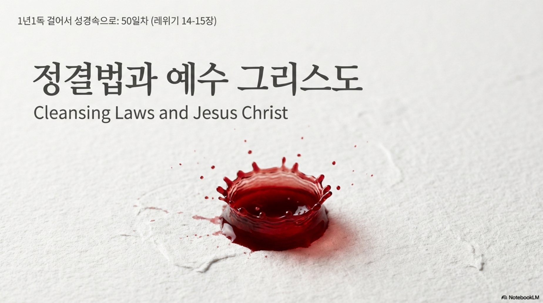 50일차 (레14-15장) *주제 : 정결법과 예수 그리스도 *Reading Guide 우리는 지금 레위기 정결법에 대해서 묵상하고 있습니다. 정결법에서 핵심은 레위기 17장 11절을 보면은 "육체의 생명은 피에 있음이라 내가 이 피를 너희에게 주어 제단에 뿌려 너희의 생명을 위하여 속죄하게 하였나니 생명이 피에 있음으로 피가 죄를 속하느니라" 정결법의 핵심은 피입니다. 피, 생명이 두 가지 개념이 같은 개념입니다. 모든 생명은 그 피가 생명과 같은 거라는 것입니다. 이 피는 드러나는 이미지라면, 그 안에 들어 있는 본래적 메시지는 뭐냐면 생명입니다.