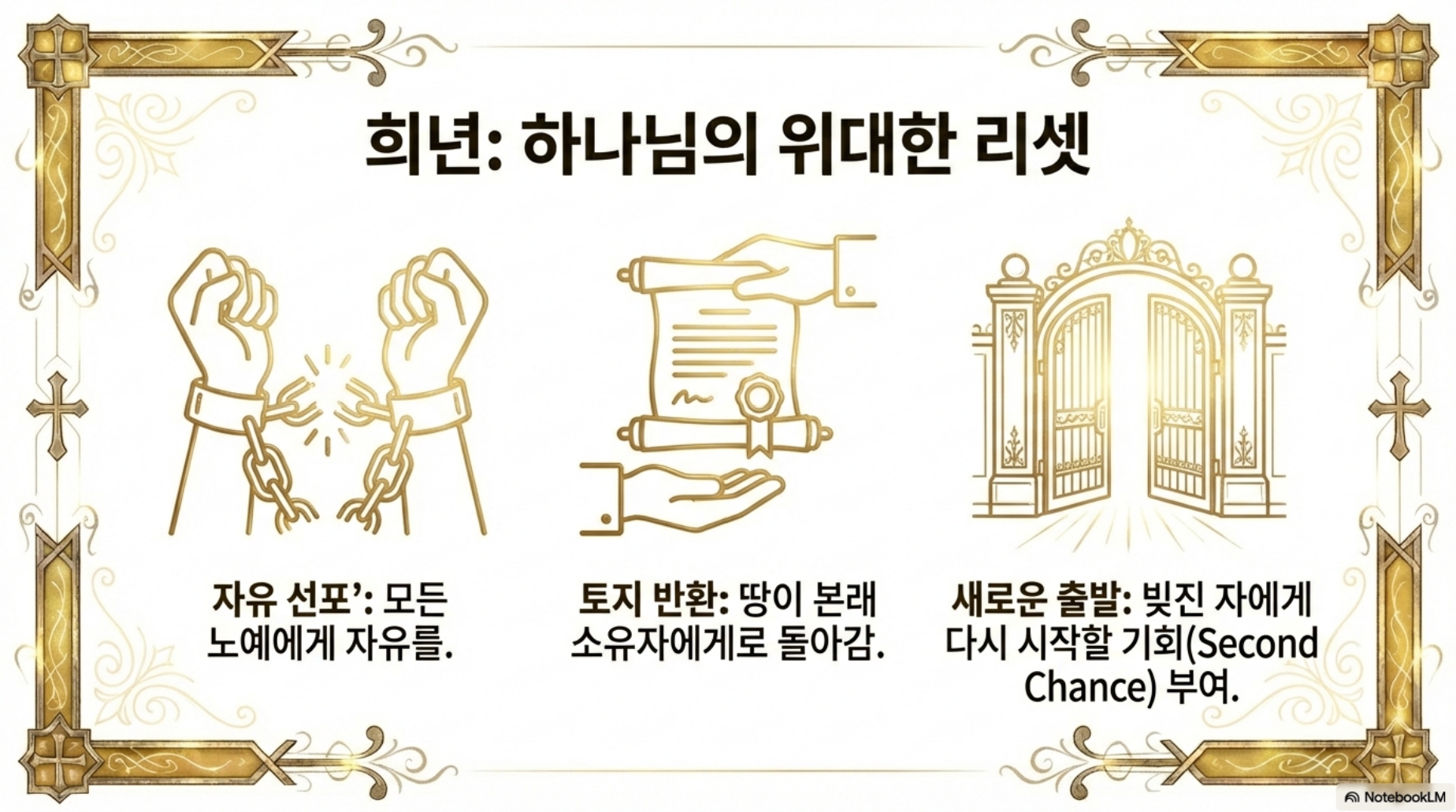희년은 매 50년마다 돌아왔습니다. 희년이 오면 비록 그 빚을 갚지 못했다 할지라도 그 땅이 본래의 소유자에게로 환원되었으며 노예에게는 자유가 주어졌습니다. 결과적으로 이들에게는 새로운 삶을 시작할 기회가 주어졌습니다.