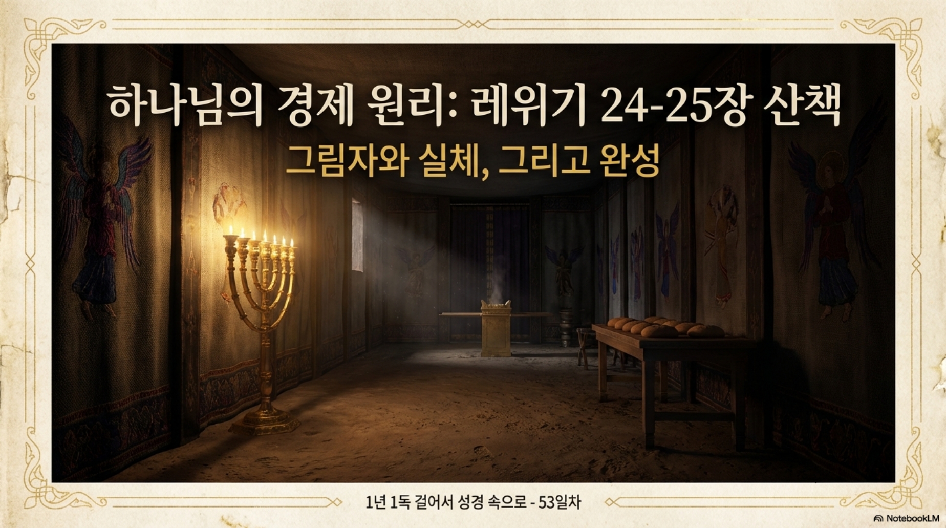 53일차 (레24-25장) *주제 : 하나님의 경제 원리 *Reading Guide 24장에는 성소에 위치한 등잔대와 진설병에 관한 규례와 신성모독 사건에 대해 소개된다. 성소에 등잔대와 진설병은 서로 마주보고 있으며 제사장은 등잔대의 기름을 간검하여 끊이지 않고 비추어 진설병에 놓인 열두 덩이의 떡을 비추었습니다. 이 떡은 문자적으로 ‘얼굴들의 떡’을 의미하여 흔히 ‘임재의 떡’으로 안식일마다 새로운 떡이 상위에 올려졌으며, 묵은 떡은 제사장들이 거룩한 곳에서 먹을 수 있었습니다.