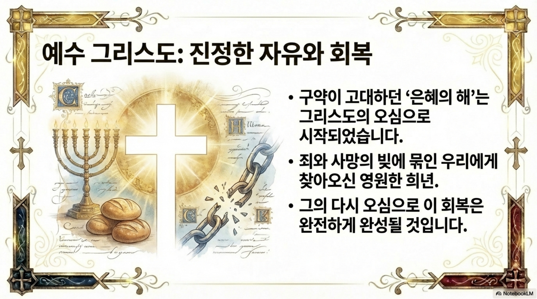 구약에서 고대하던 은혜의 해는 그리스도의 오심으로 말미암아 시작되었습니다.그리고 궁극적으로 예수 그리스도께서 다시 오심으로 완성될 것입니다. 이처럼 구약 레위기 말씀의 제사법과 정결법, 그리고 절기들이 율법을 완성하신 예수 그리스도를 통해 성취됨을 알 수 있습니다. 그래서 레위기를 알아야만 예수님의 구원의 사역을 평면이 아닌 입체적으로 알수 있다. 구약의 복음중에 복음인 레위기를 통해 예수 그리스도를 만나실 수 있기를 바랍니다.