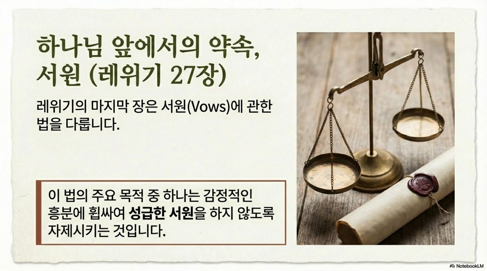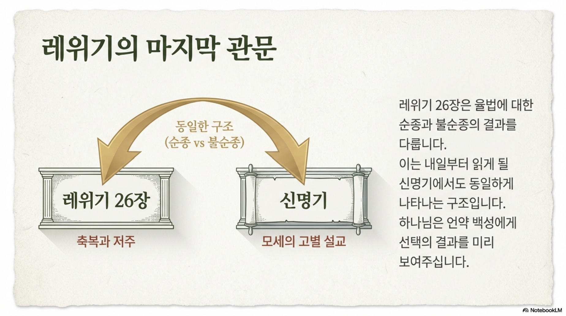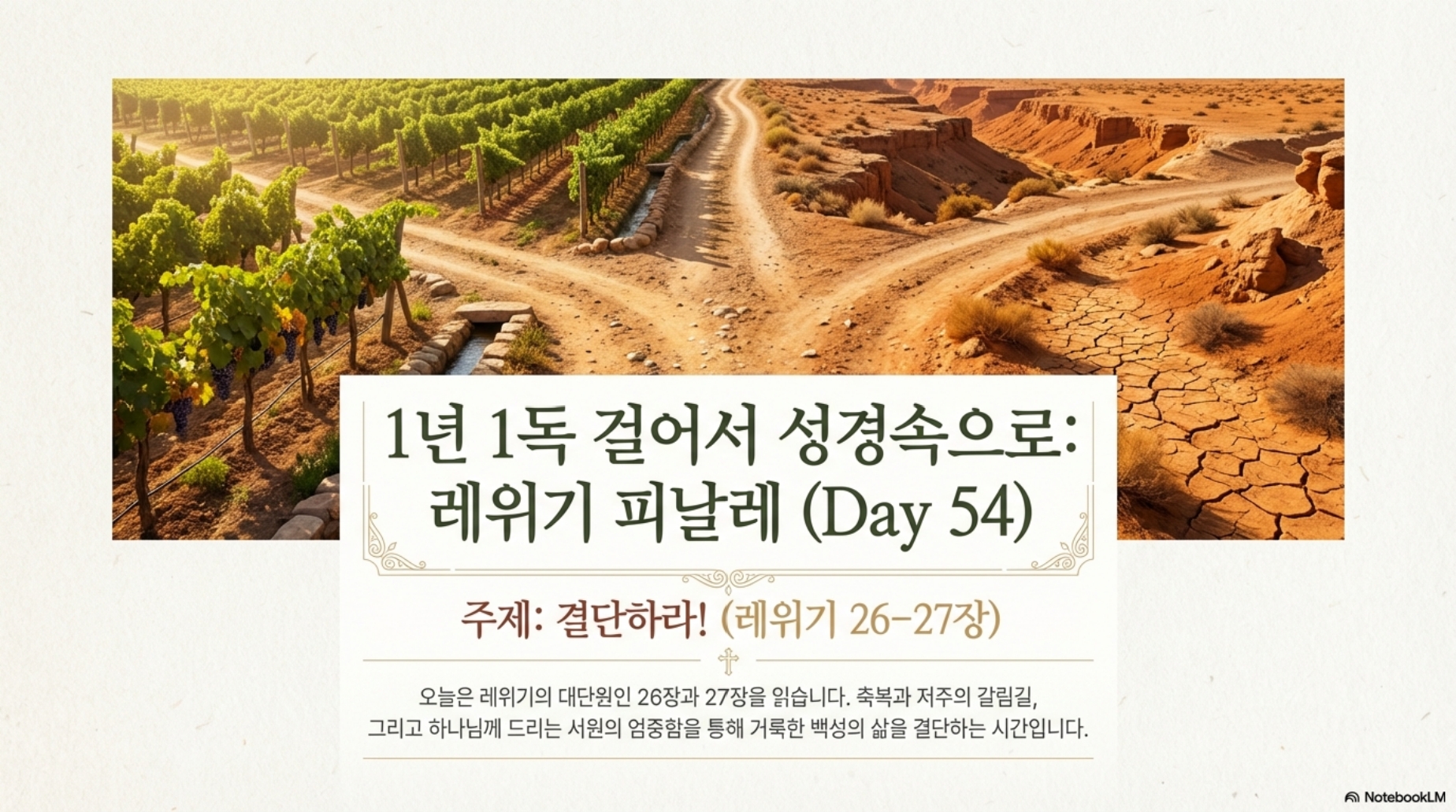 54일차 (레26-27장) *주제 : 결단하라! *Reading Guide 오늘은 마지막 레위기 26장과 27장을 읽겠습니다. 레위기 26장은 율법을 순종하는 자들에 대한 축복과 불순종하는 자들에 대한 저주를 모아놓은 것입니다. 이와 같은 구조는 내일부터 읽게 될 신명기에서도 동일하게 나타납니다. 레위기 26:3-13절은 순종에 대한 축복으로 “만일 이스라엘이 여호와의 규례대로 행하고 그 명령을 성실히 지킨다면”이라는 조건에 따라 결정됩니다. 그에 따른 축복으로는 1)비와 풍성한 산물과 2)가나안땅에서 평화(샬롬)가 보장되며 3)하나님이 그들과 임재하면서 함께할 것을 약속하십니다. 14-45절에는 축복의 반대 상황인 저주가 훨씬 많이 나타나고 있습니다. 1)질병, 기근, 전쟁에서의 패배 2)가뭄과 빈약한 추수 3)들짐승 4)염병과 기근을 초래하는 전쟁 4)전쟁과 포로 등입니다. 이것은 교육적인 목적이 있습니다. 결코 그러지 말라는 것입니다. 우리들도 자녀들에게 반복해서 경고하듯이 하나님은 순종을 통한 축복을 원하시지 불순종으로 저주를 내리는 것을 기뻐하지 않으십니다. 심판은 결코 하나님이 그의 백성을 버리셨음을 의미하지 않습니다. 그보다는 이들이 하나님의 소유이기 때문에 하나님은 이들을 징벌하실 것입니다. 만일 이들이 자신들의 죄를 고백하고 그들의 마음을 겸손히 낮추면 하나님은 당신의 언약을 기억하실 것입니다, 레위기 마지막장인 27장은 서원에 관한 법을 다루고 있습니다. 레위기 27장의 목적중의 하나가 성급한 서원을 자제하도록 하기 위한 것입니다. 서원자의 마음이 바뀌어 서원을 해지하고자 할 경우 본래 바치기로 서원한 서원물보다 더욱 비싼 값을 치를 것을 요구하거나, 아니면 마음이 바뀐 자에게 벌칙을 부과함으로 이스라엘이 일단 약속한 서원을 성취할 것을 촉구한다. 신약에서도 우리가 맹세한 서원을 지켜야 할 것을 강조하며, 성급한 서원을 하지 말라고 가르칩니다. 레위기에서는 서원한 자가 후에 마음이 바뀌었을 경우 서원물 외에 추징금을 지불하게 함으로 서원 무르는 것을 자제케 한 반면, 신약은 맹세를 자제할 것을 가르칩니다. 마5:33절 “나는 너희에게 이르노니 도무지 맹세하지 말지니…. 오직 너희 말은 옳다 옳다, 아니라 아니라 하라” 오늘로서 레위기를