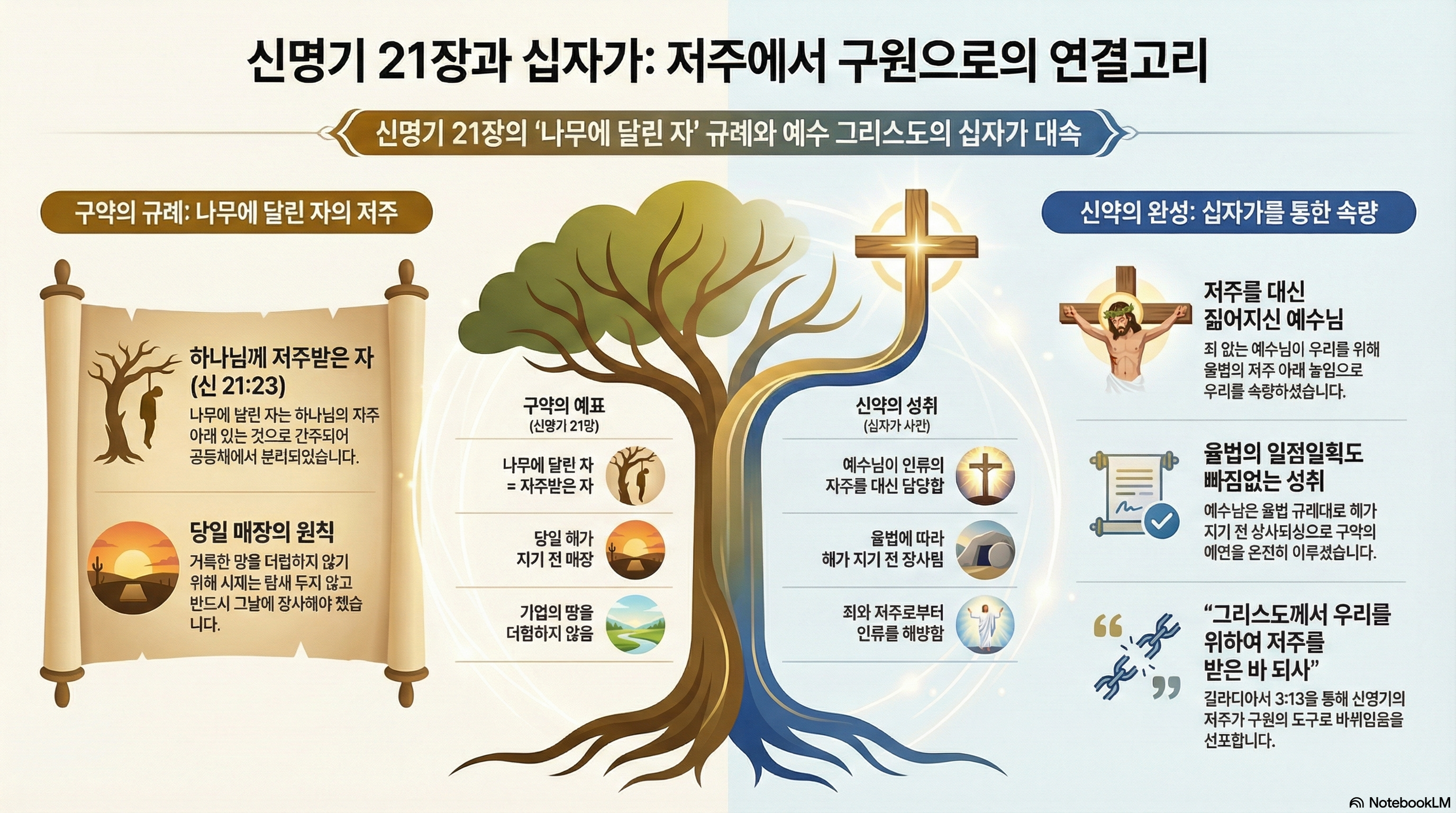 2. 속죄와 구속의 완성 신명기의 규정에 따르면, 나무에 달린 시체는 그날 안에 반드시 장사해야 했습니다. 예수님 역시 유대 관습에 따라 그날 해가 지기 전에 장사되었습니다(마태복음 27:57-60). 이것은 율법을 완전하게 이루시는 과정이었으며, 예수님이 인류의 죄를 담당하셨다는 증거가 됩니다. 예수님은 십자가에서 죽으심으로 인해 "저주받은 자"처럼 보였지만, 실제로는 그 저주를 깨뜨리고 인류를 구속하는 길을 여셨습니다. 다시 말해, 신명기 21장의 저주가 예수님을 통해 구원의 도구로 바뀌는 것입니다.