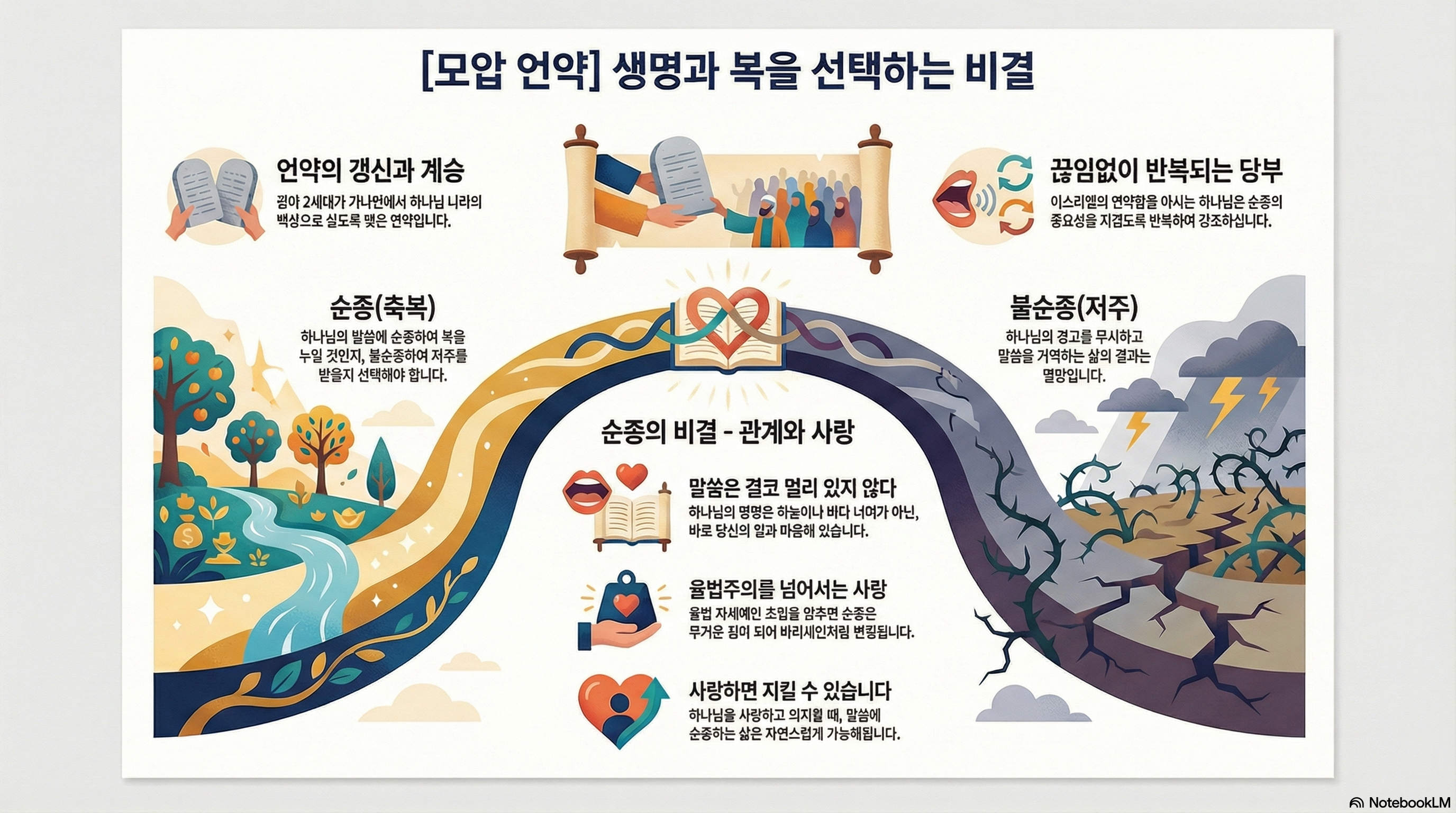 광야 1세대와 '시내산 언약'을 맺으셨다면, 여기 모압에서는 그 2세대와 '모압 언약'을 맺으신 것입니다. 모압언약은 시내산에서 맺었던 언약을 갱신함으로 약속의 땅 가나안에 들어갈 이스라엘이 하나님 나라의 백성으로서 합당한 삶을 살도록 다시한번 주지시키며 다짐을 받습니다. 요약하자면 '순종은 축복, 불순종은 저주' 선택하라!는 것입니다.