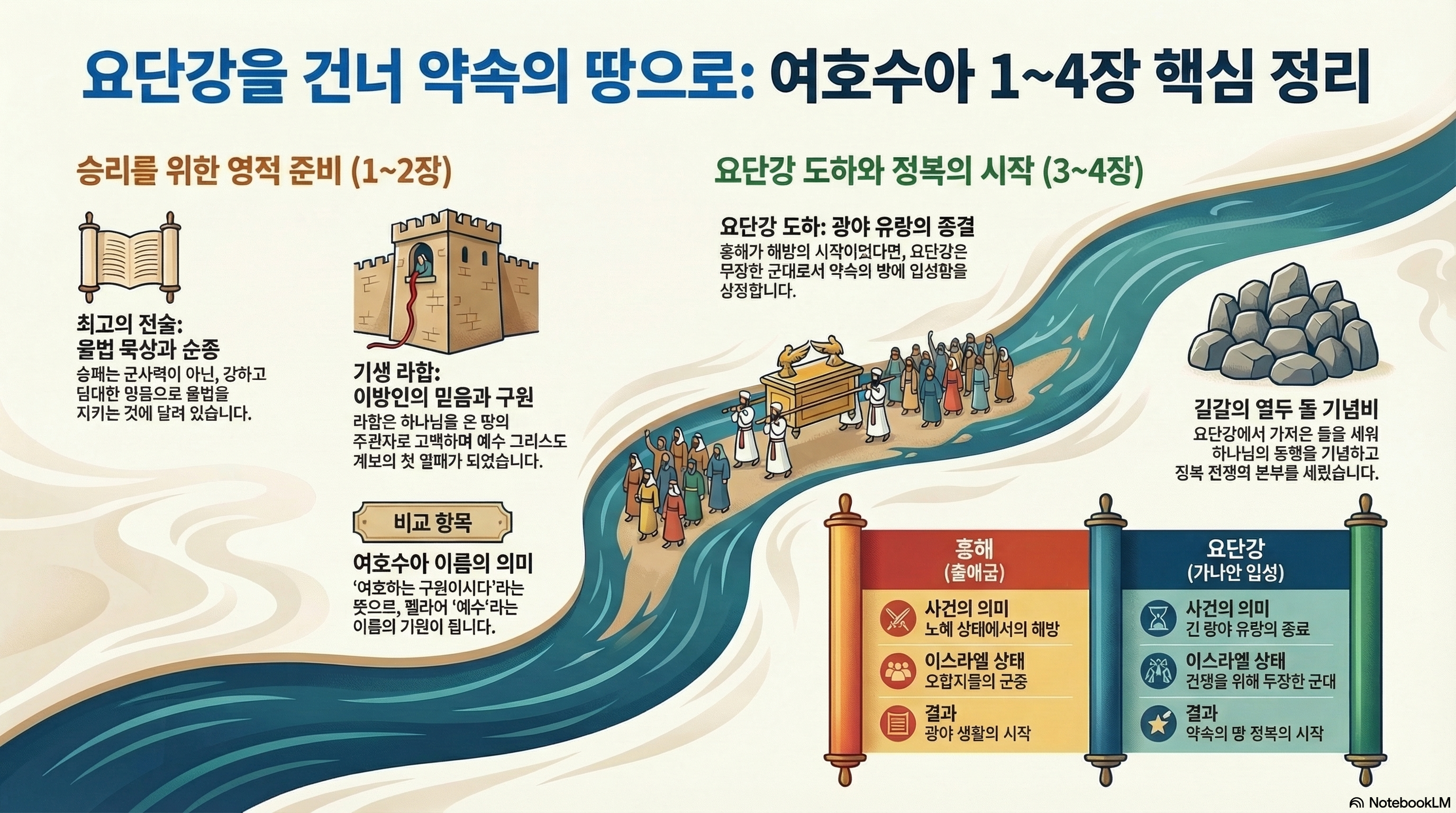 66일차(수1-4장) *주제 : 요단강을 건너다! *Reading Guide *여호수아서는 어떤 책인가 여호수아서의 제목은 이 책의 주요 인물인 여호수아의 이름을 따라 붙여진 이름입니다. 그의 이름은 본래 '호세아'(구원)였으나 모세에 의해 '여호수아' '여호와는 구원 이시다)로 개명됩니다. 이 이름이 후에 헬라어 '예수'가 나오게 됩니다.' 여호수아서는 하나님이 아브라함에게 주셨던 땅의 약속이 성취되는 과정의 이야기입니다. 하나님이 오경에서 주셨던 중요한 약속이 성취되는 과정을 보여주는 동시에, 약속의 땅에서 펼쳐질 다음 무대를 준비한다는 점에서 이 책은 오경과 나머지 역사서를 이어주는 연결 고리 역할을 합니다.
