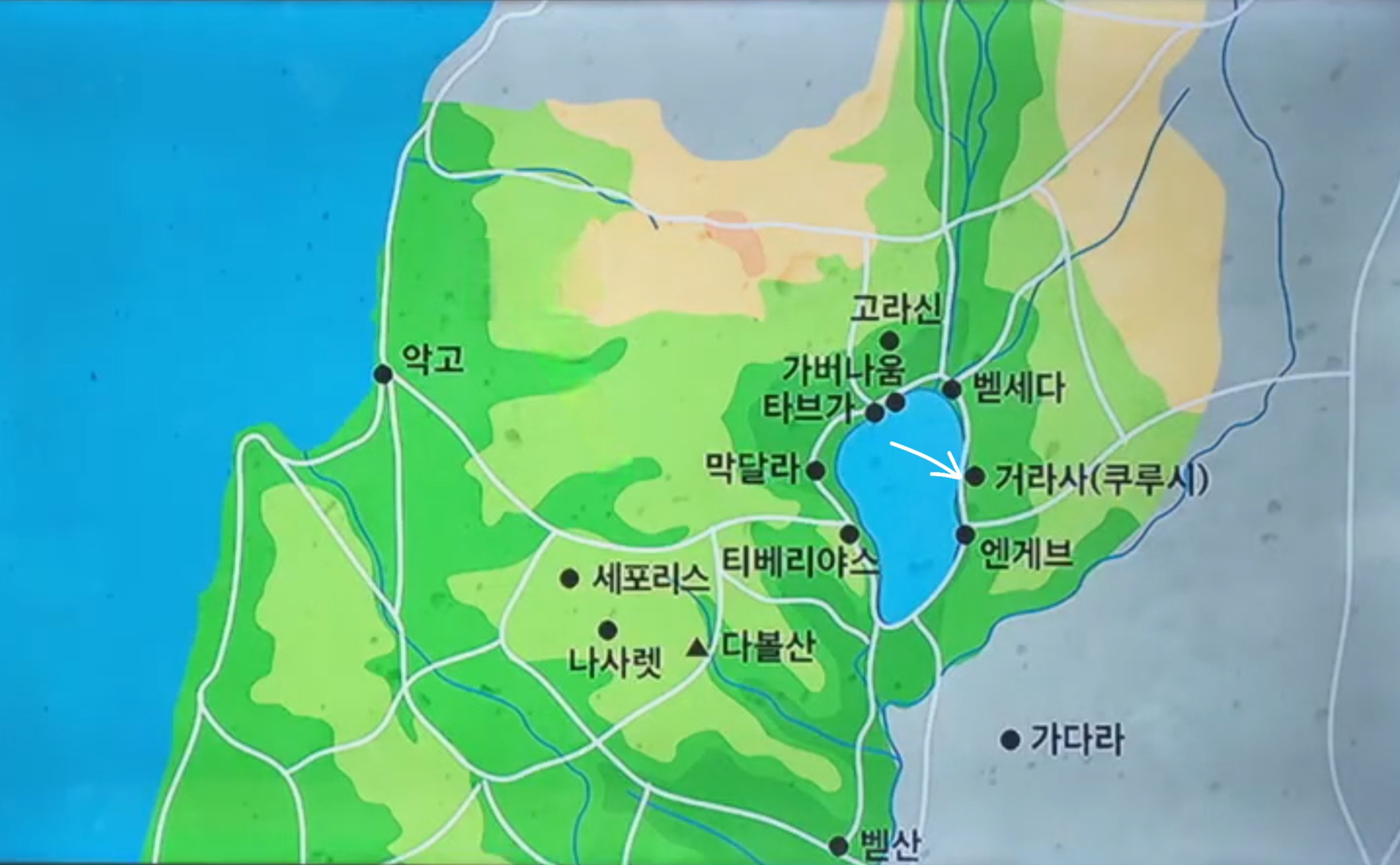 "예수님은 제자들과 갈릴리 호수를 건너다가 큰 폭풍을 만나지만, 바람과 파도를 잠잠하게 하십니다. 거라사 지방에 도착한 예수님은 군대 귀신돌린 사람을 만나 귀신을 돼지 떼로 내쫓습니다. 돼지들이 호수에 빠져 죽자, 마을 사람들은 두려워하며 예수님께 떠나 달라고 요청합니다. 예수님은 귀신에서 해방된 사람에게 집으로 돌아가 하나님이 하신 일을 전하라고 하십니다. 예수님의 제2차 갈릴리 사역의 내용인 것을 염두에 두고 읽읍시다. 사진자료 : 갈릴리와 거라사 지방