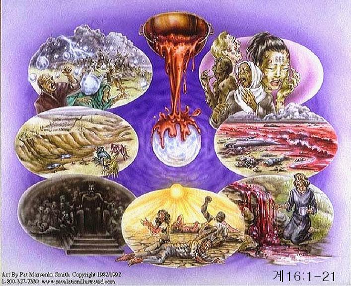 요한계시록 13~16장 말씀은 우리에게 묻습니다. “나는 세상의 표를 따라 살고 있는가, 어린양의 이름을 따라 살고 있는가?” *사진자료: 그림으로 보는 요한계시록 1) 용과 두짐승-짐승의 표 666 2)일곱대접 심판 시리즈 ![]() ![]() 새번역 요한계시록 13장 1. 나는 바다에서 짐승 하나가 올라오는 것을 보았습니다. 그 짐승은 뿔 열과 머리 일곱이 달려 있었는데, 그 뿔 하나하나에 왕관을 쓰고 있고, 그 머리 하나하나에는 하나님을 모독하는 이름이 붙어 있었습니다. 2. 내가 본 그 짐승은 표범과 비슷한데, 그 발은 곰의 발과 같고, 그 입은 사자의 입과 같았습니다. 그 용이 자기 힘과 왕위와 큰 권세를 이 짐승에게 주었습니다. 3. 그 머리들 가운데 하나는 치명상을 입은 듯하였습니다. 그러나 그 치명적인 상처가 나으니, 온 세상은 놀라서 그 짐승을 따라갔습니다. 4. 용이 그 짐승에게 권세를 주니, 사람들은 그 용에게 경배하였습니다. 또 그들은 "누가 이 짐승과 같으랴? 누가 이 짐승과 맞서서 싸울 수 있으랴?" 하고 말하면서, 그 짐승에게 경배하였습니다. 5. 그 짐승은, 큰소리를 치며 하나님을 모독하는 말을 하는 입을 받고, 마흔두 달 동안 활동할 권세를 받았습니다. 6. 그 짐승은 입을 열어서 하나님을 모독하였으니, 하나님의 이름과 거처와 하늘에 사는 이들을 모독하였습니다. 7. 그 짐승은 성도들과 싸워서 이길 것을 허락받고, 또 모든 종족과 백성과 언어와 민족을 다스리는 권세를 받았습니다. 8. 그러므로 땅 위에 사는 사람 가운데서, 죽임을 당한 어린 양의 생명책에 창세 때부터 이름이 기록되어 있지 않은 사람은, 모두 그에게 경배할 것입니다. 9. 귀가 있는 사람은 들으십시오. 10. "사로잡혀 가기로 되어 있는 사람이면, 사로잡혀 갈 것이요, 칼에 맞아서 죽임을 당하기로 되어 있는 사람이면, 칼에 맞아서 죽임을 당할 것이다." 여기에 성도들의 인내와 믿음이 필요합니다. 11. 나는 또 땅에서 다른 짐승 하나가 올라오는 것을 보았습니다. 그것은 어린 양처럼 뿔이 둘 있고, 용처럼 말을 하였습니다. 12. 이 짐승은 첫째 짐승이 가진 모든 권세를 그 첫째 짐승을 대신하여 행사하였습니다. 이 짐승은, 땅과 땅 위에 사는 모든 사람들로 하여금 치명상에서 나음을 받은 그 첫째 짐승에게 절하게 하였습니다. 13. 또 그 짐승은 큰 기적들을 행하였는데, 사람들이 보는 앞에서 하늘에서 불이 땅에 내려오게도 하였습니다. 14. 그리고 그 첫째 짐승을 대신해서 행하도록 허락받은 그 기적들을 미끼로 해서 땅 위에 사는 사람들을 미혹하였습니다. 땅 위에 사는 사람들에게, 칼에 맞아서 상처를 입고서도 살아난 그 짐승을 위하여 우상을 만들라고 말하였습니다. 15. 그리고 둘째 짐승이 능력을 받아서 첫째 짐승의 우상에게 생기를 넣어 주고, 그 짐승의 우상으로 하여금 말을 하게도 하고, 또 우상에게 경배하지 않는 사람은 모두 죽임을 당하게도 하였습니다. 16. 또 작은 자나 큰 자나, 부자나 가난한 자나, 자유인이나 종이나 할 것 없이, 다 그들의 오른손이나 이마에 표를 받게 하였습니다. 17. 누구든지 이 표를 가진 사람, 곧 그 짐승의 이름이나, 그 이름을 나타내는 숫자로 표가 찍힌 사람이 아니면, 아무도 팔거나 사거나 할 수 없게 하였습니다. 18. 여기에 지혜가 필요합니다. 지각이 있는 사람은 그 짐승을 상징하는 숫자를 세어 보십시오. 그 수는 어떤 사람을 가리키는데, 그 수는 육백육십육입니다. 새번역 요한계시록 14장 1. 또 내가 보니, 어린 양이 시온 산에 서 있었습니다. 그 어린 양과 함께 십사만 사천 명이 서 있었는데, 그들의 이마에는 어린 양의 이름과 그의 아버지의 이름이 적혀 있었습니다. 2. 그리고 나는 많은 물이 흐르는 소리와도 같고 큰 천둥소리와도 같은 음성이 하늘에서 울려오는 것을 들었습니다. 내가 들은 음성은 거문고를 타고 있는 사람들의 노랫가락과 같았습니다. 3. 그들은 보좌와 네 생물과 그 장로들 앞에서 새 노래를 부르고 있었습니다. 땅에서 구원을 받은 십사만 사천 명 밖에는, 아무도 그 노래를 배울 수 없었습니다. 4. 그들은 여자들과 더불어 몸을 더럽힌 일이 없는, 정절을 지킨 사람들입니다. 그들은 어린 양이 가는 곳이면, 어디든지 따라다니는 사람들입니다. 그들은 사람들 가운데서 하나님과 어린 양에게 드리는 첫 열매로서 구원을 받았습니다. 5. 그들의 입에서는 거짓말을 찾을 수 없고, 그들에게는 흠잡을 데가 없었습니다. 6. 나는 또 다른 천사가 하늘 한가운데서 날아다니는 것을 보았습니다. 그에게는, 땅 위에 살고 있는 사람과 모든 민족과 종족과 언어와 백성에게 전할, 영원한 복음이 있었습니다. 7. 그는 큰 소리로 외쳤습니다. "너희는 하나님을 두려워하고, 그분께 영광을 돌려라. 하나님께서 심판하실 때가 이르렀다. 하늘과 땅과 바다와 물의 근원을 만드신 분께 경배하여라." 8. 또 두 번째 다른 천사가 뒤따라와서 말하였습니다. "무너졌다. 무너졌다. 큰 도시 바빌론 이 무너졌다. 바빌론 은 자기 음행으로 빚은 진노의 포도주를 모든 민족에게 마시게 한 도시다." 9. 또 세 번째 다른 천사가 그들을 뒤따라와서 큰 소리로 말하였습니다. "그 짐승과 그 짐승 우상에게 