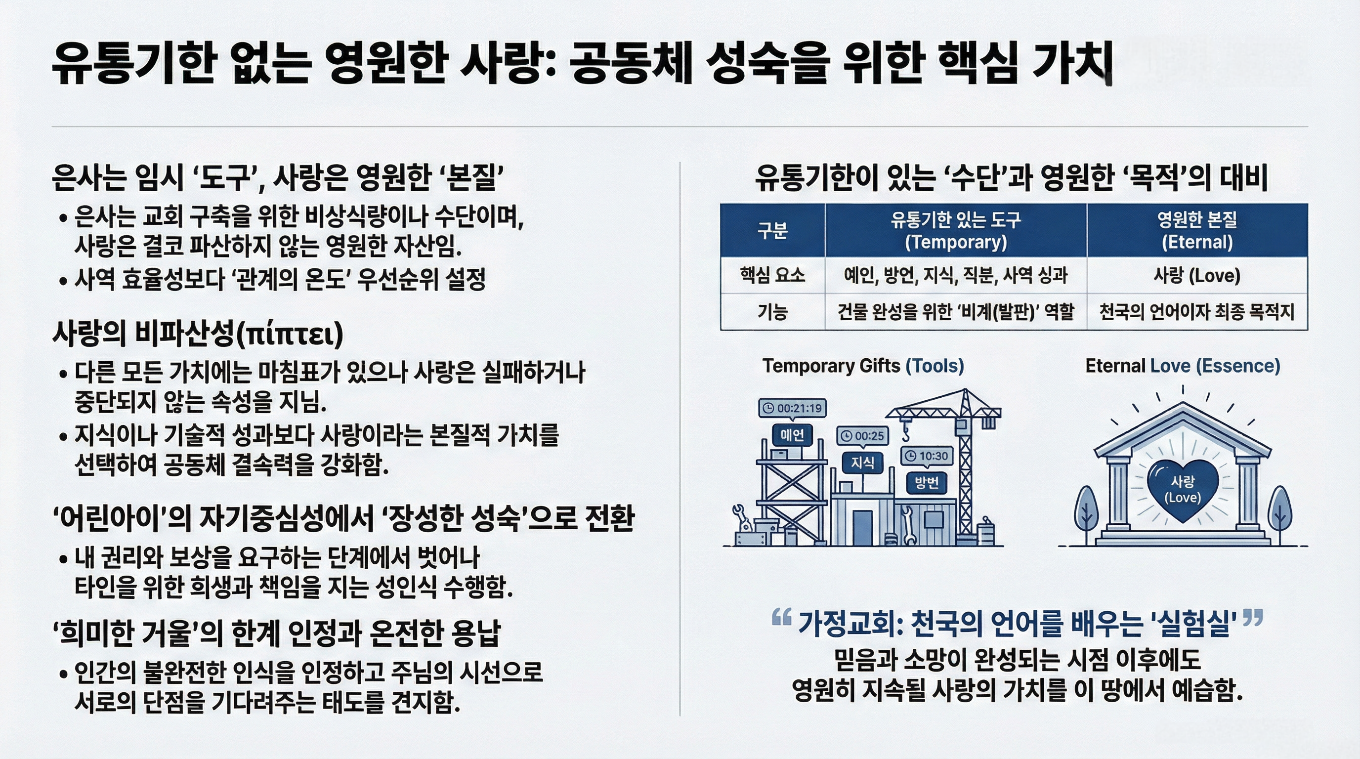 [성경본문] 고린도전서13:8-13절 개역개정8. 사랑은 언제까지나 떨어지지 아니하되 예언도 폐하고 방언도 그치고 지식도 폐하리라 9. 우리는 부분적으로 알고 부분적으로 예언하니 10. 온전한 것이 올 때에는 부분적으로 하던 것이 폐하리라 11. 내가 어렸을 때에는 말하는 것이 어린 아이와 같고 깨닫는 것이 어린 아이와 같고 생각하는 것이 어린 아이와 같다가 장성한 사람이 되어서는 어린 아이의 일을 버렸노라 12. 우리가 지금은 거울로 보는 것 같이 희미하나 그 때에는 얼굴과 얼굴을 대하여 볼 것이요 지금은 내가 부분적으로 아나 그 때에는 주께서 나를 아신 것 같이 내가 온전히 알리라 13. 그런즉 믿음, 소망, 사랑, 이 세 가지는 항상 있을 것인데 그 중의 제일은 사랑이라