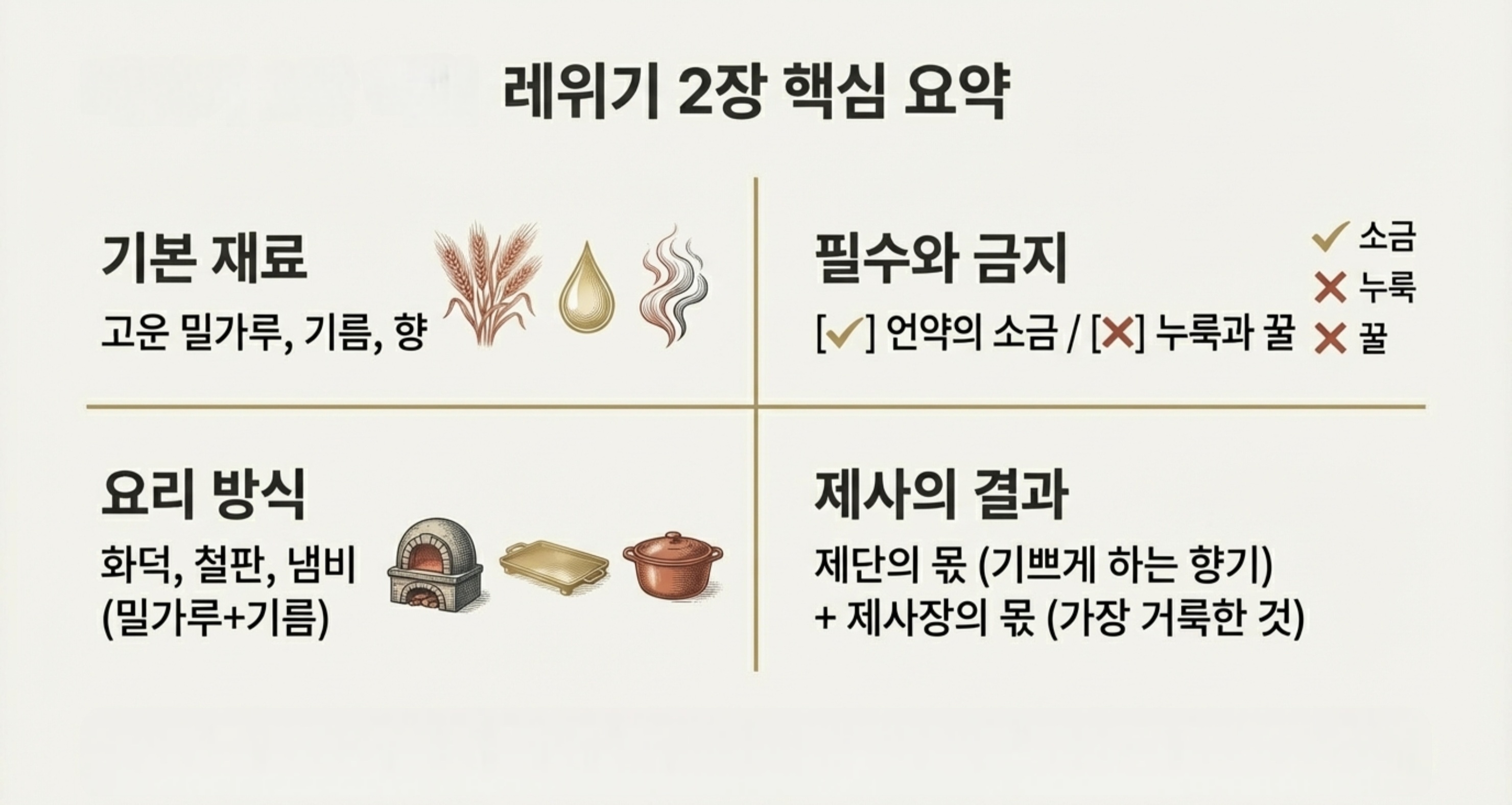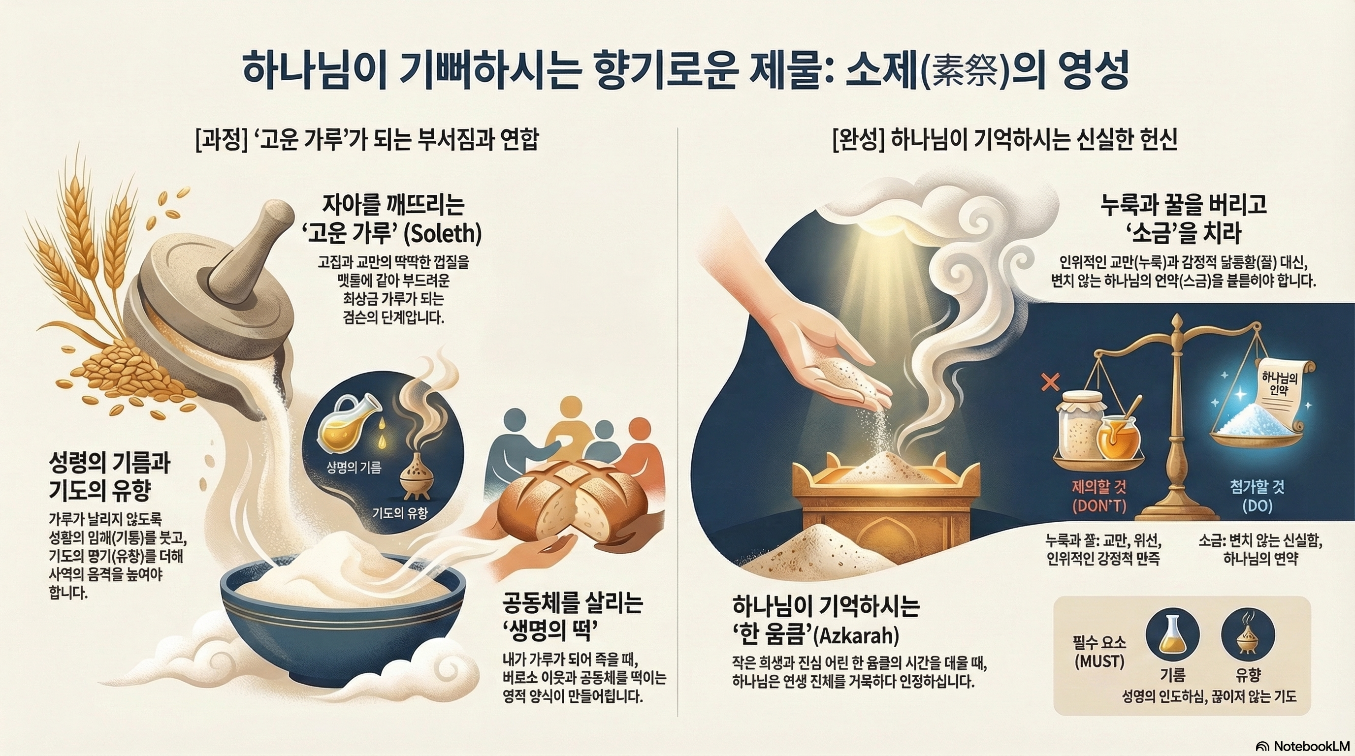 [성경본문] 레위기2:1-3절 개역개정1. 누구든지 소제의 예물을 여호와께 드리려거든 고운 가루로 예물을 삼아 그 위에 기름을 붓고 또 그 위에 유향을 놓아 2. 아론의 자손 제사장들에게로 가져갈 것이요 제사장은 그 고운 가루 한 움큼과 기름과 그 모든 유향을 가져다가 기념물로 제단 위에서 불사를지니 이는 화제라 여호와께 향기로운 냄새니라 3. 그 소제물의 남은 것은 아론과 그의 자손에게 돌릴지니 이는 여호와의 화제물 중에 지극히 거룩한 것이니라