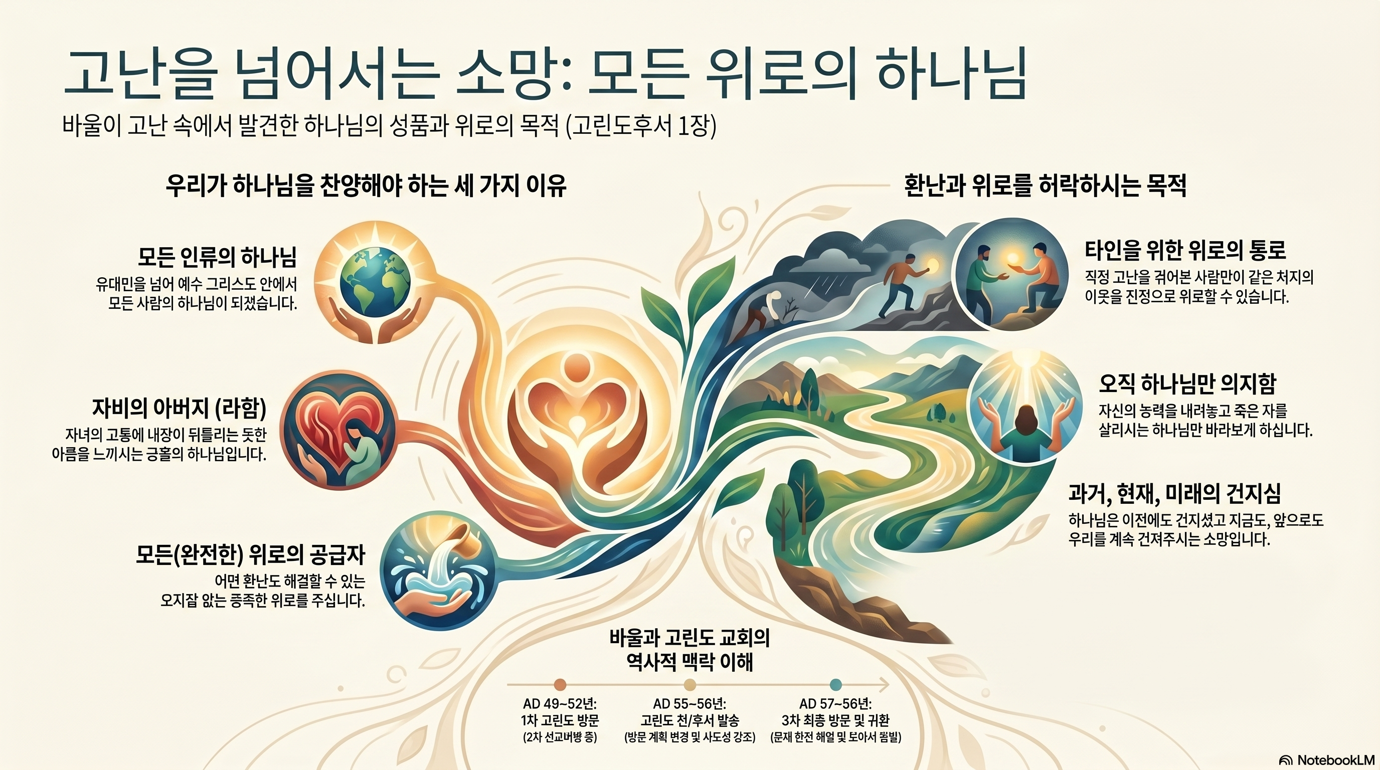 [성경본문] 고린도후서1:3-7절 개역개정3. 찬송하리로다 그는 우리 주 예수 그리스도의 하나님이시요 자비의 아버지시요 모든 위로의 하나님이시며 4. 우리의 모든 환난 중에서 우리를 위로하사 우리로 하여금 하나님께 받는 위로로써 모든 환난 중에 있는 자들을 능히 위로하게 하시는 이시로다 5. 그리스도의 고난이 우리에게 넘친 것 같이 우리가 받는 위로도 그리스도로 말미암아 넘치는도다 6. 우리가 환난 당하는 것도 너희가 위로와 구원을 받게 하려는 것이요 우리가 위로를 받는 것도 너희가 위로를 받게 하려는 것이니 이 위로가 너희 속에 역사하여 우리가 받는 것 같은 고난을 너희도 견디게 하느니라 7. 너희를 위한 우리의 소망이 견고함은 너희가 고난에 참여하는 자가 된 것 같이 위로에도 그러할 줄을 앎이라