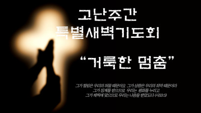 ​2026년 고난주간 특별새벽기도회                        *1일차(월) -  멈춤 : 하나님께 집중하다! (시편 46:1~11절)*2일차(화) - 돌아봄 : 내 마음의 방향을 다시 묻다! (시편 119:57~64절)*3일차(수) - 순종 : 작은 한 걸음을 내딛다! (잠언 16:1~9절)*4일차(목) - 사랑 : 하나님이 나에게, 나를 통해 일하시는 시간 (로마서 5:6~11절)*5일차(금) - 소망 : 하나님이 여시는 미래를 보다! (로마서 8:18~25절)*6일차(토) 다시 걷기 : 변화된 삶으로 나아가다! (로마서12:1~2절, 히브리서12:1~2절)