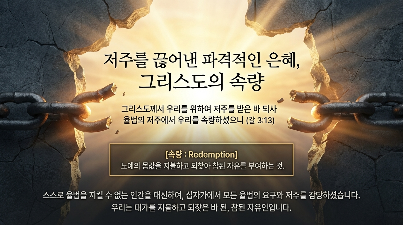 [성경본문] 갈라디아서3:10-14절 개역개정10. 무릇 율법 행위에 속한 자들은 저주 아래에 있나니 기록된 바 누구든지 율법 책에 기록된 대로 모든 일을 항상 행하지 아니하는 자는 저주 아래에 있는 자라 하였음이라 11. 또 하나님 앞에서 아무도 율법으로 말미암아 의롭게 되지 못할 것이 분명하니 이는 의인은 믿음으로 살리라 하였음이라 12. 율법은 믿음에서 난 것이 아니니 율법을 행하는 자는 그 가운데서 살리라 하였느니라 13. 그리스도께서 우리를 위하여 저주를 받은 바 되사 율법의 저주에서 우리를 속량하셨으니 기록된 바 나무에 달린 자마다 저주 아래에 있는 자라 하였음이라 14. 이는 그리스도 예수 안에서 아브라함의 복이 이방인에게 미치게 하고 또 우리로 하여금 믿음으로 말미암아 성령의 약속을 받게 하려 함이라